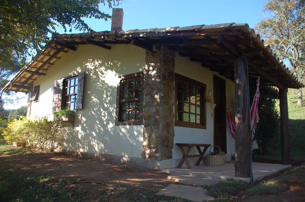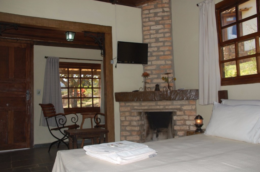 A hospedagem é em chalés confortáveis, independentes, com lareira, TV a cabo, frigobar e varanda com rede.
