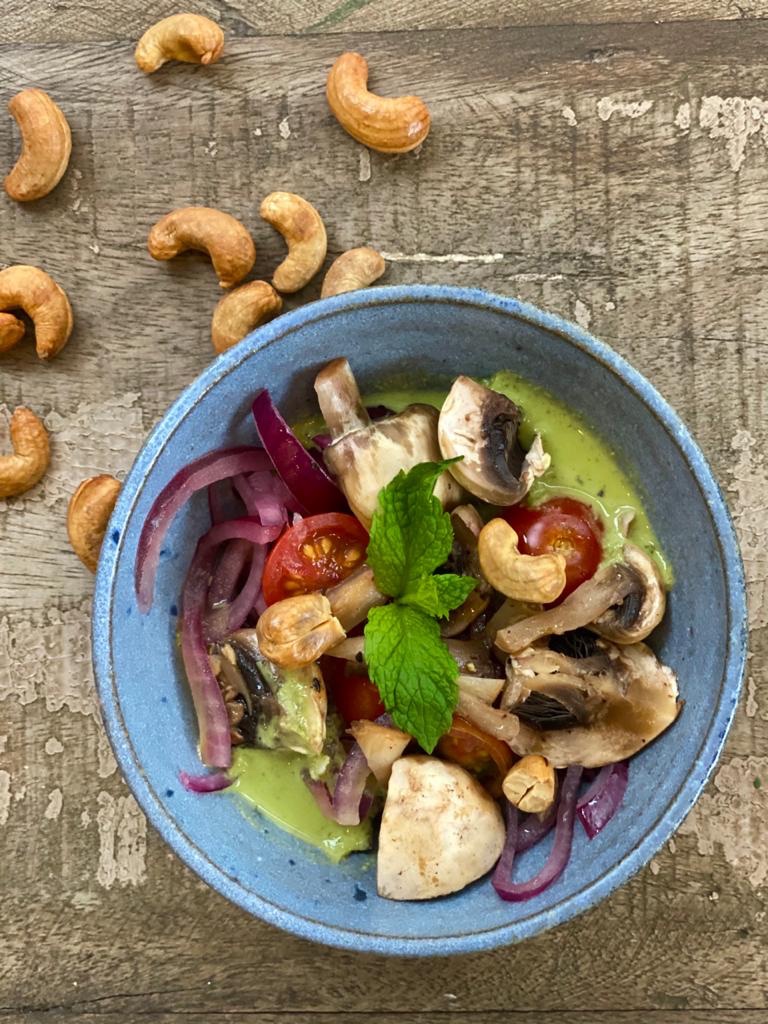 Ceviche de cogumelos com cebola roxa e leite de capim santo, casquinha de jaca com creme de castanhas, pupunha assada ao pesto de manjericão e hambúrguer de grão de bico com tahine são alguns pratos e petiscos do novo menu da pousada.