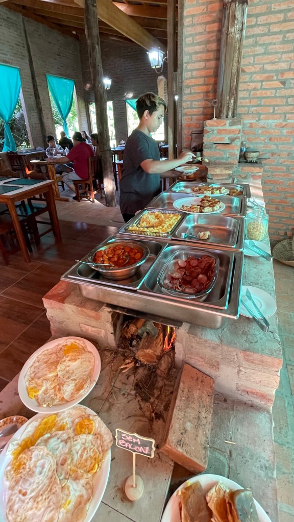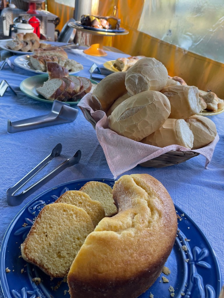 O café da manhã da pousada é generoso e resgata os sabores da culinária do interior com bolos, pães e biscoitinhos feitos artesanalmente, assim como queijos, geleias, iogurtes naturais, sucos de frutas da estação e aquele café passado na hora, servido nos tradicionais bules de ágata.