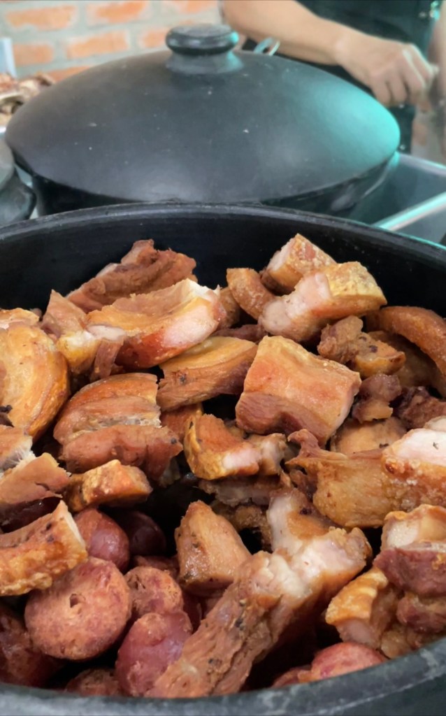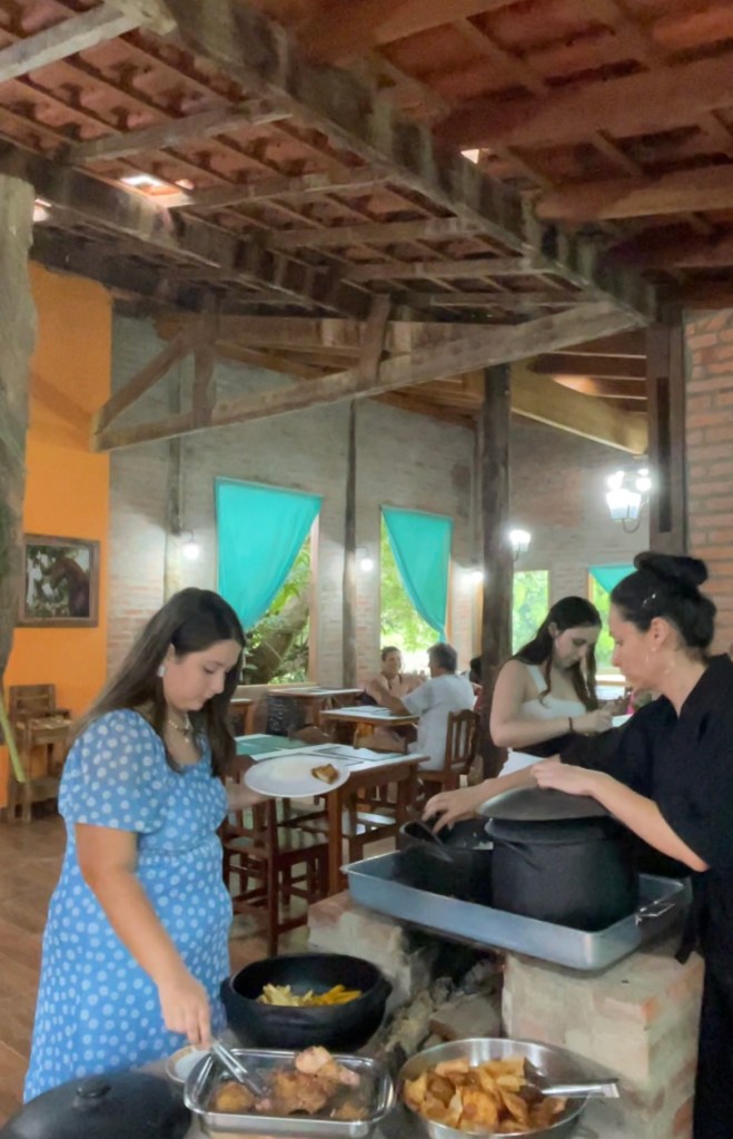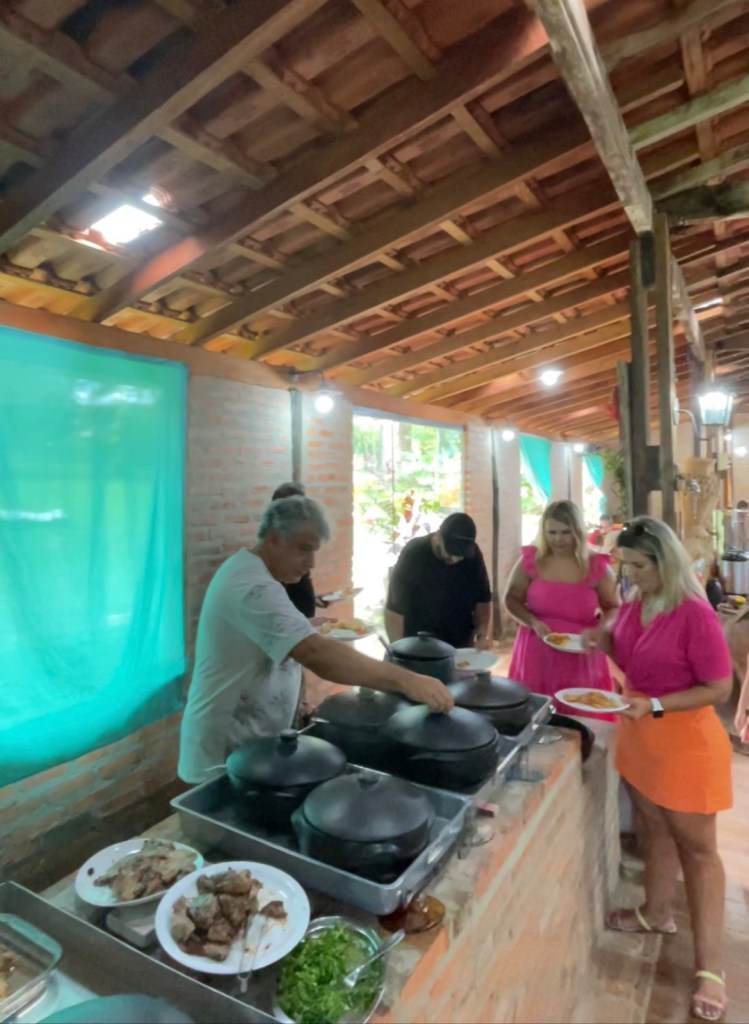 A cozinha comandada por Jamile funciona aos domingos, tanto para o café da manhã da roça, como para o almoço caipira. É bom reservar mesa porque as vagas são limitadas. Sobre o fogão de lenha fumegando ficam as panelas de barro com feijoada, arroz, peixe, o torresmo sequinho, bifes de fraldinha, bisteca e frango frito.